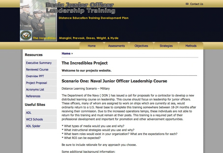 School Project- Distance Education. I project managed this final course project, and the team was composed of three other classmates. I did the web design, assigned parts of the project, organized the material, serverd as SME, general overview of task. All procees of ADDIE are inclusive on this website. up to design phase. |